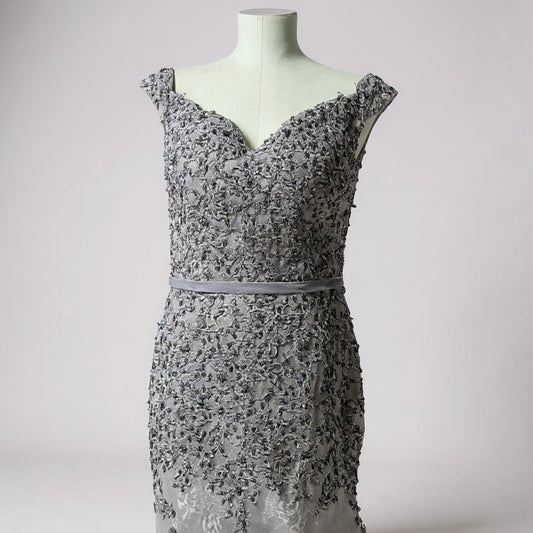Elegant Silver Beaded Lace Evening Gown