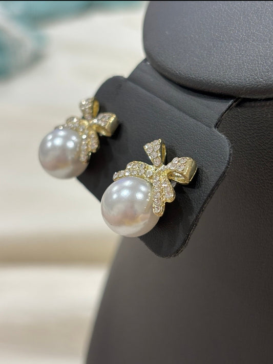 Pearl Stud Earrings with Rhinestone Bow